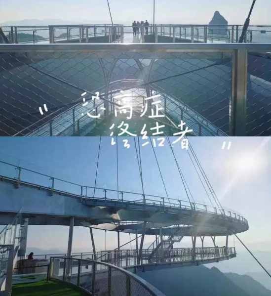 位于海拔869米的悬崖峭壁之上,为单塔斜拉悬挑双层钢结构玻璃观景台,塔高30米,悬挑45米,悬空400米,悬挑面积1000余平方米。